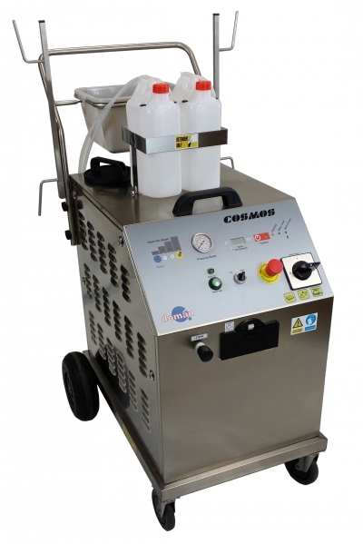 Questa versione del COSMOS è in grado di lavorare anche a 18 KW. Viene fornito con uno speciale adattatore di sicurezza che si collega ad un alimentatore di 32 Ampere. L'aggiunta del vapore umido moltiplica l'azione meccanica e accelera la velocità d'applicazione.