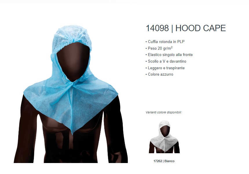 PRODOTTO: Cappuccio in PLP, elastico singolo alla fronte, scollo a V e davantino, leggero e traspirante, non sterile. MATERIALE: PLP (polipropilene) 20 gr/mq + elastico, tutti i materiali sono atossici. UTILIZZO: Destinato al personale impiegato in attività