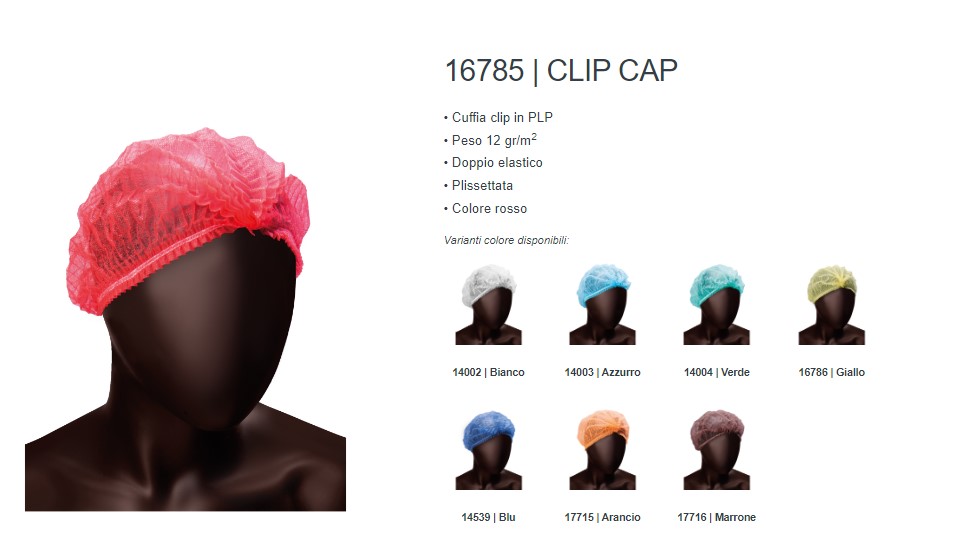 - La cuffia monouso Ajsia 16785 CLIP CAP è realizzata in PLP, plissettata e con doppio elastico di tenuta.
