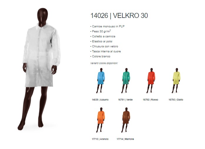 - Il camice monouso Ajsia 14026 VELKRO 30 è realizzato in PLP, con colletto a camicia, chiusura con velcro, elastico ai polsi e tasca interna al cuore.