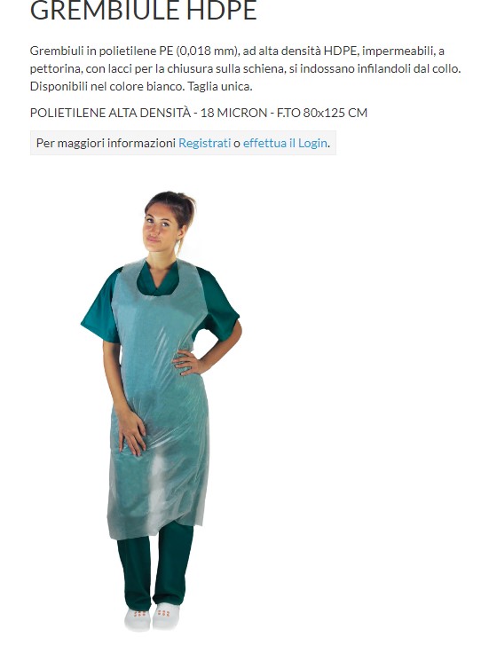 - Grembiuli in polietilene PE (0,018 mm), ad alta densità HDPE, impermeabili, a pettorina, con lacci per la chiusura sulla schiena, si indossano infilandoli dal collo. Disponibili nel colore bianco. Taglia unica.