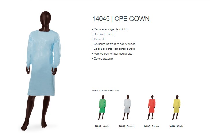- Il camice avvolgente monouso Ajsia 14045 CPE GOWN è realizzato in CPE, girocollo, chiusura posteriore con fettucce, spalle coperte con dorso aerato e loop per tenuta pollice.