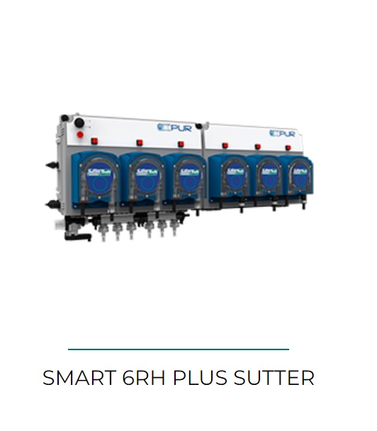 Sistema di dosaggio per lavatrici con capacità oltre 25 Kg, per il dosaggio di 6 prodotti con portata 30 -120 L/h. Sistema personalizzato "Sutter Professional" a 6 pompe con kit di installazione, lance d'aspirazione, n. 2 tubi peristaltici di ricambio,