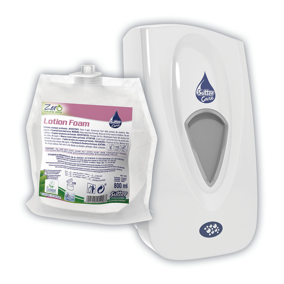 Confezionato in pouch da 800 ml, con dosatore personalizzato SUTTER CARE con sistema Captive e con finestra grigia, che rende ancora più elegante il dosatore e permette allo stesso tempo di controllare il livello di consumo del prodotto. Sistema ad inserimento selettivo della ricarica (oltre 1300 erogazioni). Erogazione 0,6 ml / dose.